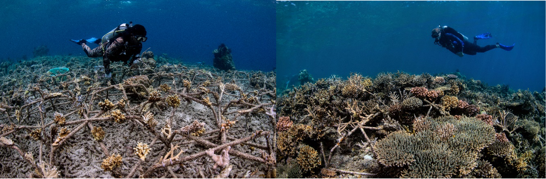 The AI found that immature restored reefs, similar to the one pictured left, still sounded similar to a degraded reef. However, mature sites, like the one pictured right, had returned to a fully healthy soundtrack.