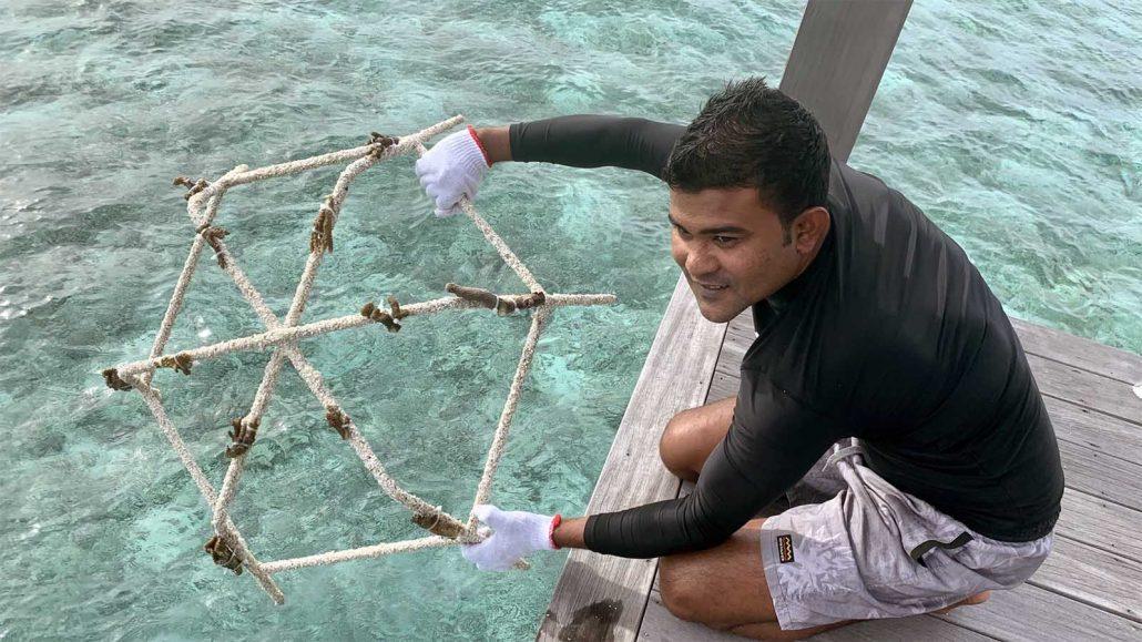 Hurawalhi Resort has a strong interest in the protection of the coral reefs that their business, tourists and island communities depend on. In August 2021, Mars Sustainable Solutions trained their staff in Reef Star restoration, establishing a MARRS web of Reef Stars on the top reef near Kashibo. In November 2021, the restoration area was extended down the reef slope in front of the 5.8 Undersea Restaurant, with regular monitoring activities following each build.
